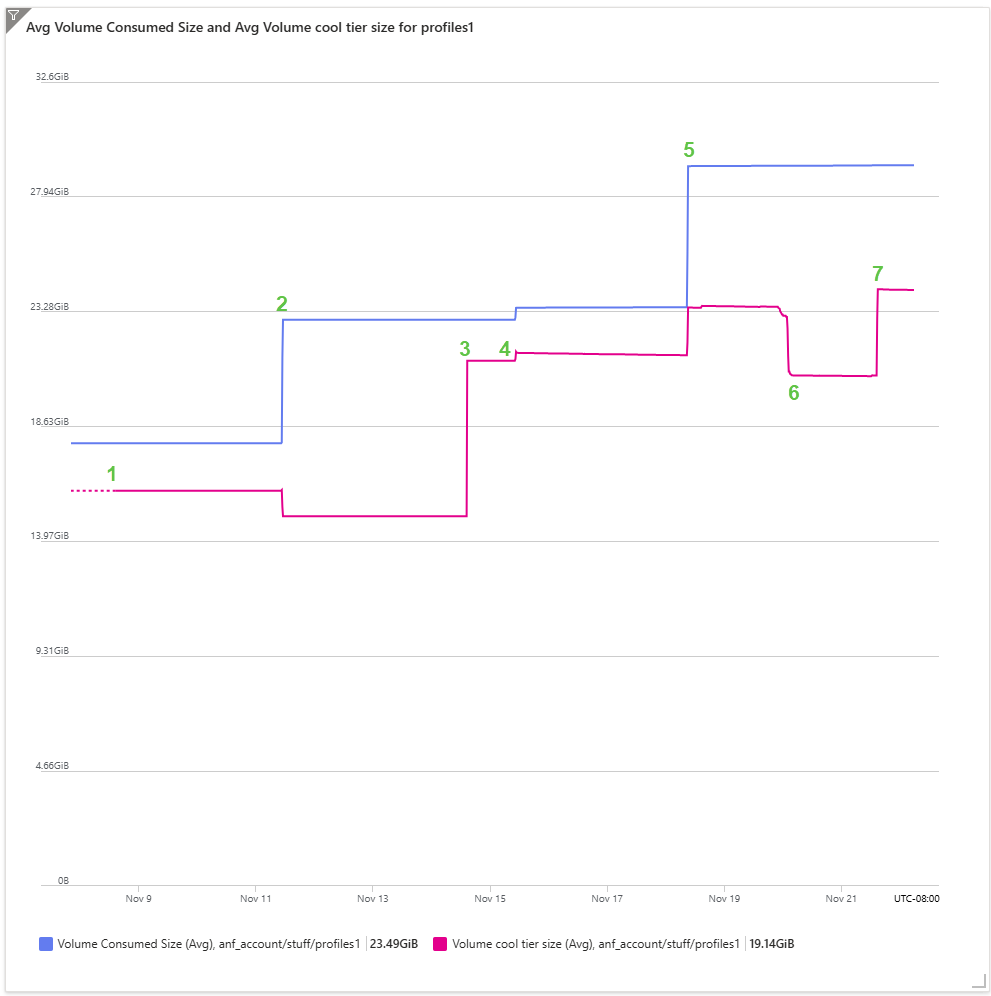 Below this numbered list is a screenshot of the total storage and cool storage during these tests. I’ve numbered several moments for clarity. The blue line represents the total data, magenta line is cool data, both in GiBs.